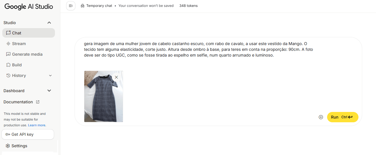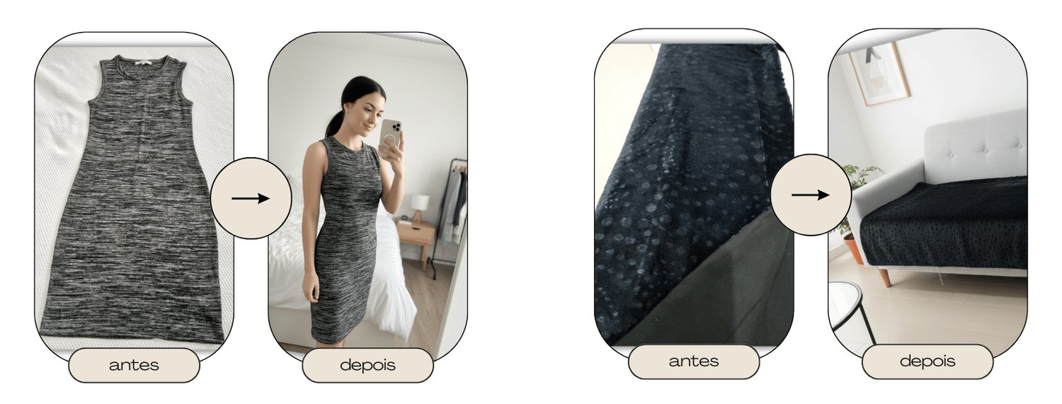 Eu escrevo algo como: "Mostra este vestido vestido numa pessoa, com luz natural, em pose casual. Mantém a cor exata e todos os defeitos visíveis."