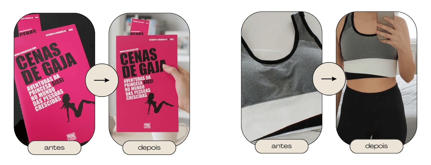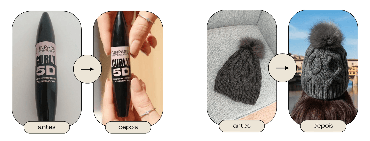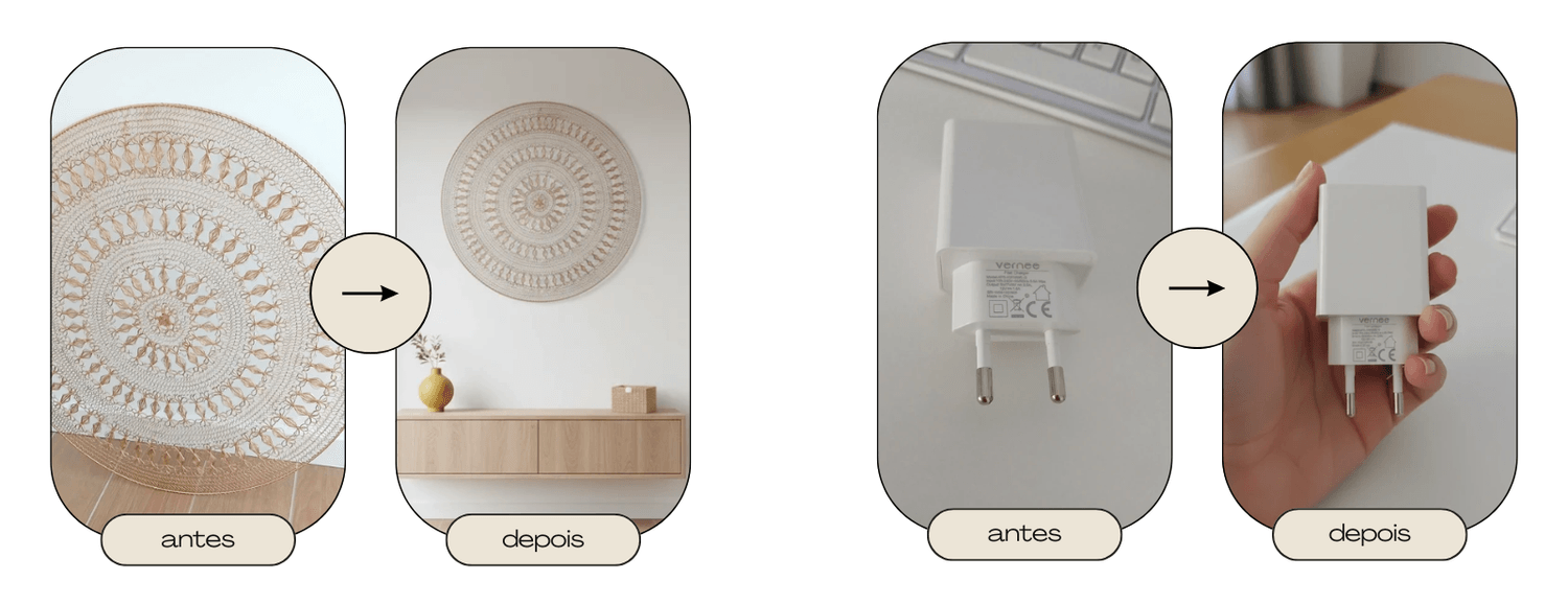Se o vestido tem uma mancha, ela continua lá na foto. Se o livro tem a lombada estragada, mantém-se visível. A diferença é que agora o comprador vê o artigo como se estivesse numa situação real de uso.